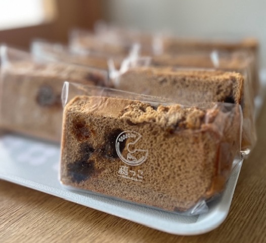 題して「黒糖ラテ」のシフォンケーキ。エスプレッソ香るコーヒー生地に黒糖を散りばめて焼いています。