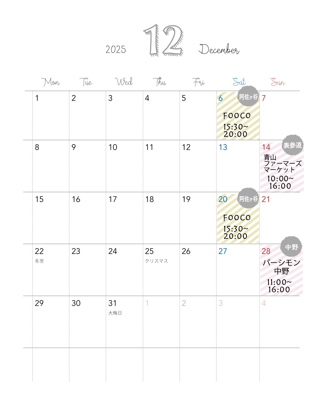 2025年のラストスパート✨12月はしばらくぶりの中野、青山ファーマーズマーケットで出店します…