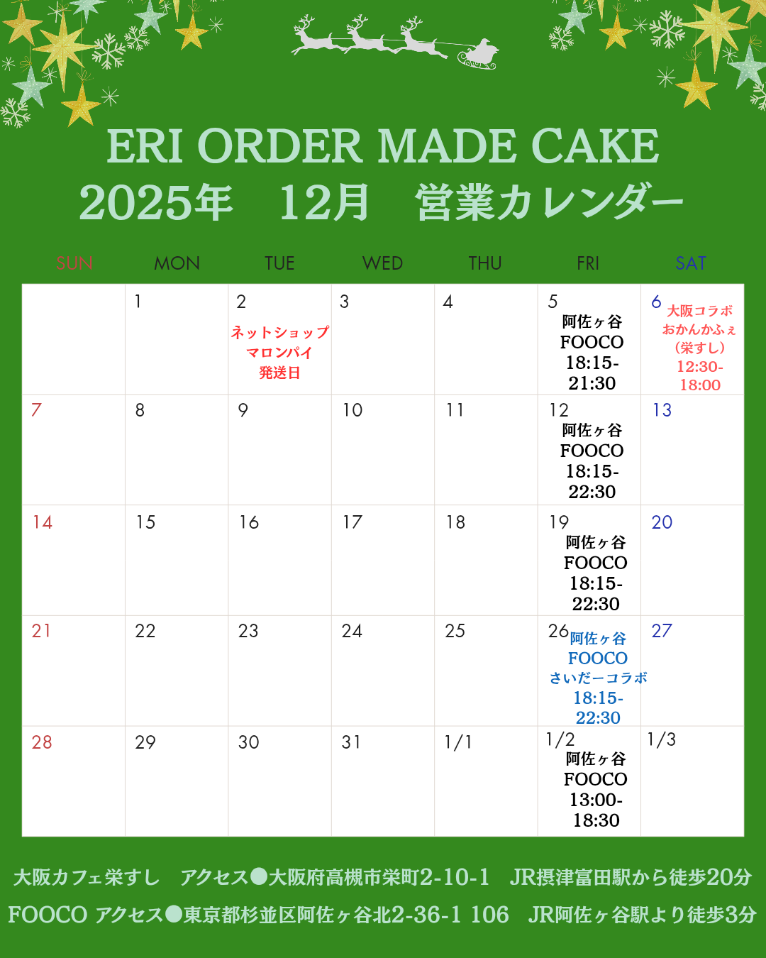 ERI ORDER MADE CAKE、12月も毎週金曜日の営業となります。時間が少し変わりますのでご確認くださいませ🙏
