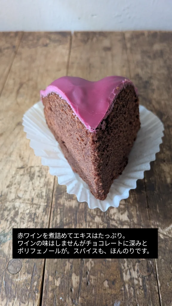 カベルネ・ソーヴィニヨンを10分の1まで煮詰めて、スパイスやフルーツ類の香り豊かにしっとり焼き上げています。フォンダンの色はこの煮詰めたワインと秋映りんごの皮の部分のシロップで作っています。フルーティーでとても美味しいケーキです。