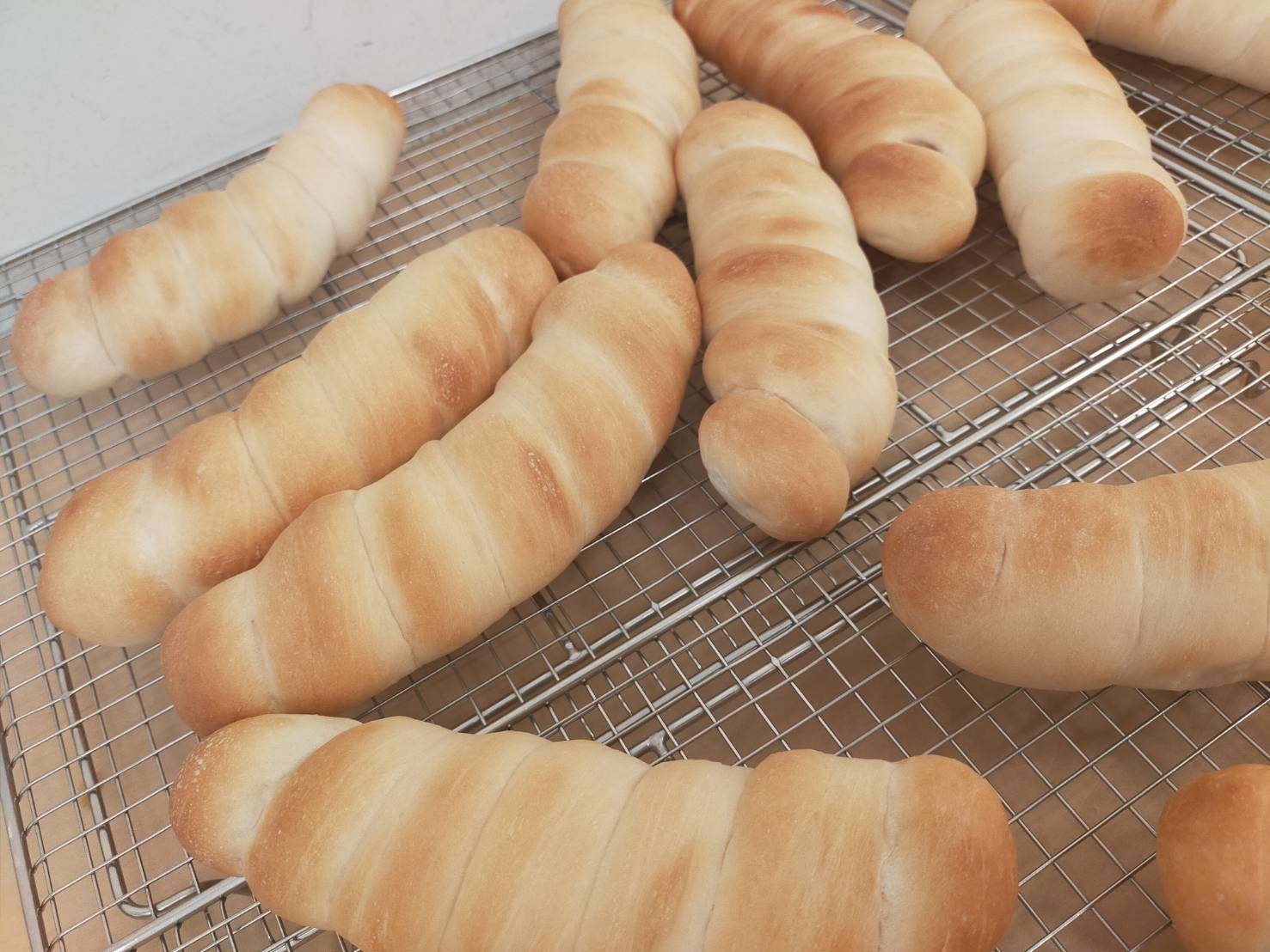 写真のウインナーぐるぐるパンも人気商品のひとつです。ジューシーなロングウインナーをふわふわパン生地で巻いており、お子様から大人の方々まで幅広くご支持いただいています。