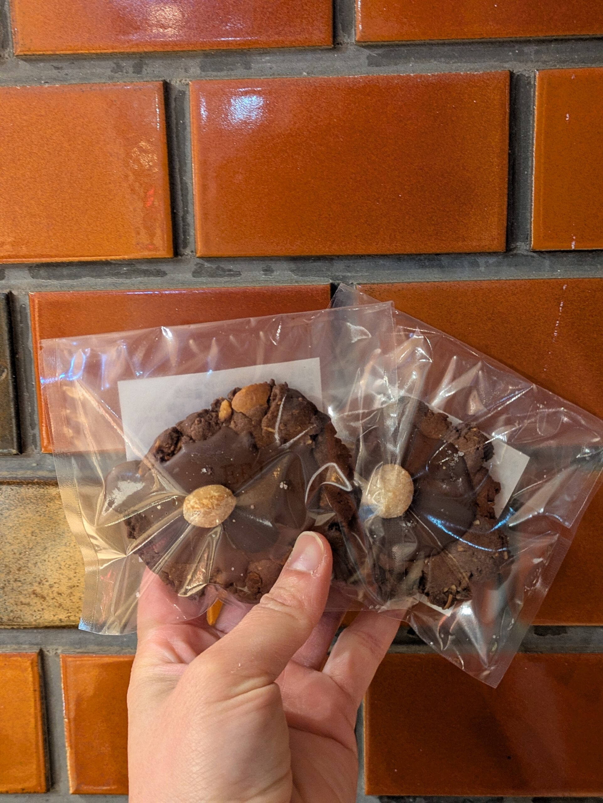 ココナッツとマカダミアナッツを使用した、食感が楽しいクッキー。チョコレートが表面にかかった、見た目にも美味しいクッキーです。チョコレート部分には藻塩を少しかけていて、甘じょっぱいアクセントに。