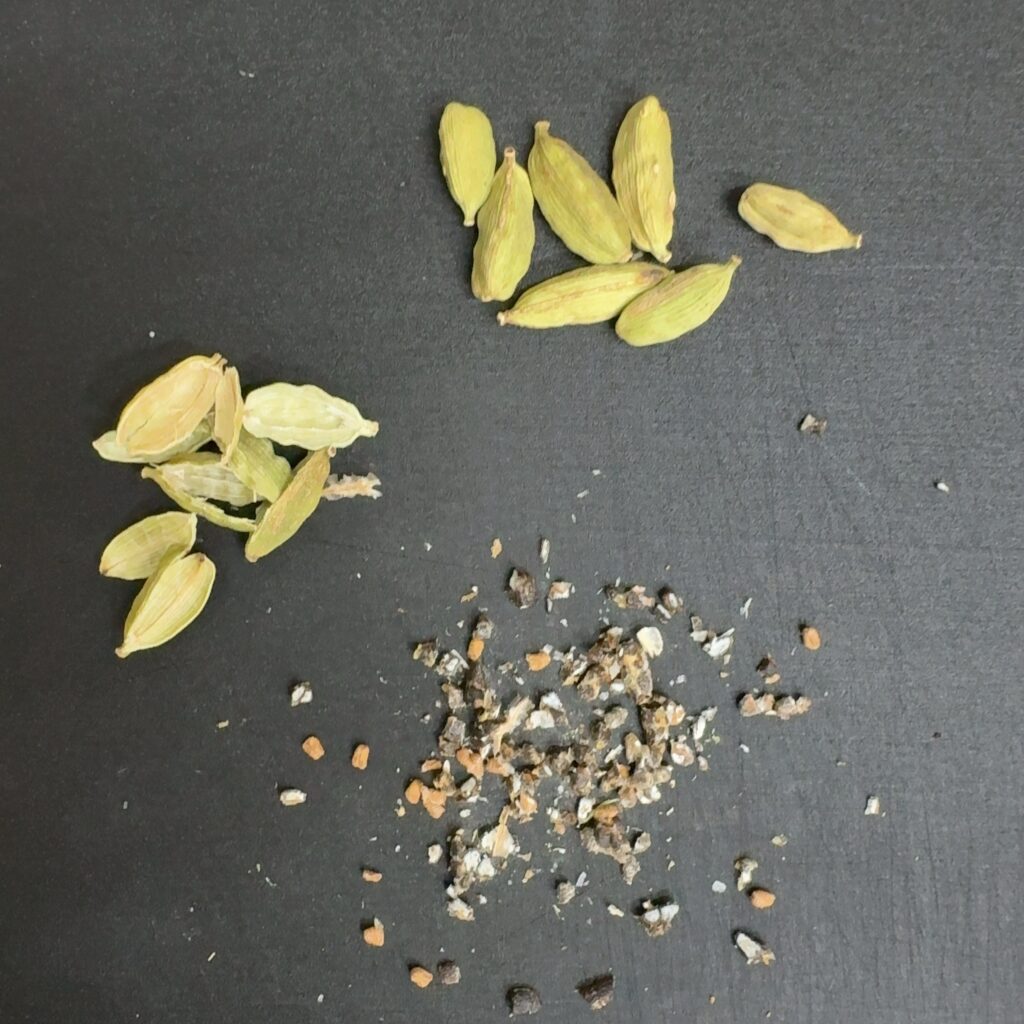 カルダモンを割って中のシードを包丁で刻むと、あの素晴らしい香りが!