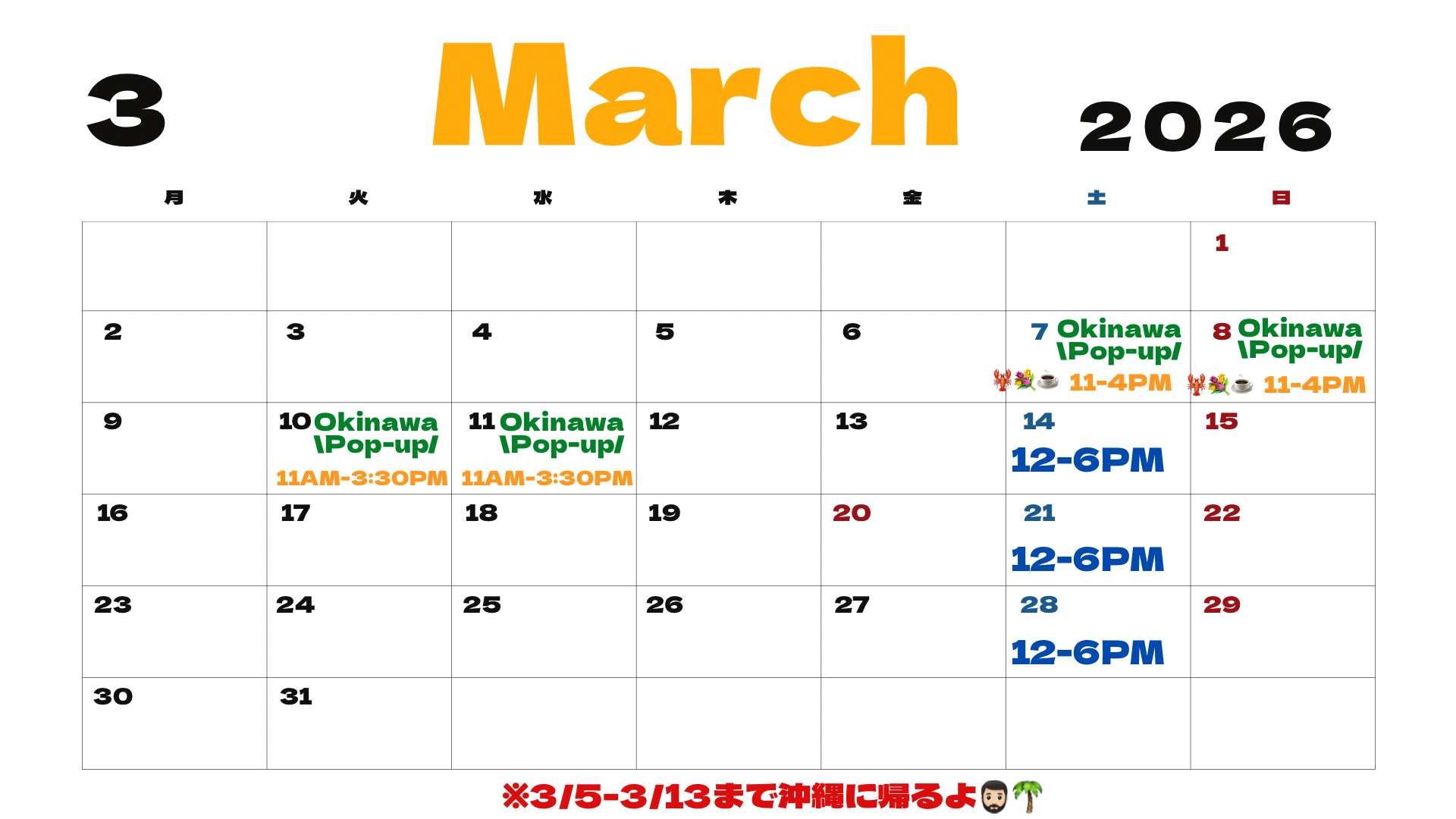 3月は沖縄に帰省してポップアップ出店します!