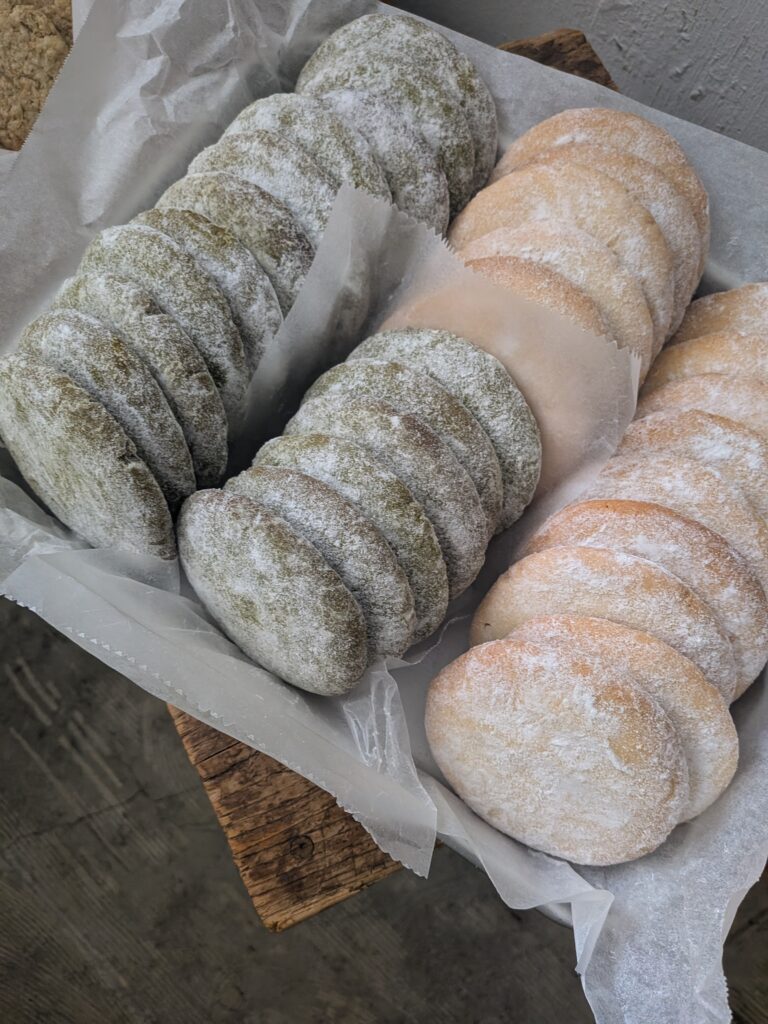 サブレはフランス語、クッキーは英語ですけれど、基本的に食感で名前を使い分けています。ホロホロほどけるような食感のものにはサブレというように。ソレイユは直径10センチ位。大きなお煎餅くらいの大きさです。バニラはしっかりとブルボンバニラが、抹茶は奥深くほろ苦くしっかりと抹茶が香ります。一度に1ダースぐらいづつ、そうたくさんは作れないのですが、焼いた日にはほぼ全て当日にお客様の元へ。冷蔵庫でご保管いただき、ちょっと冷たい状態でお召し上がりいただくとバターの味わいが引き立って、とても美味しいです。もちろん常温でも。是非一度ご賞味下さい。