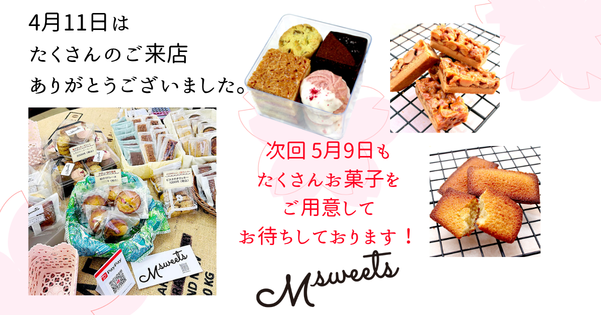 回を重ねるごとに、リピートしてくださるお客様も増え、かわす会話も多くなってきたことをうれしく思います。楽しみにしてた、久しぶりだね、この間のアレ美味しかった!。。などなど、パワーをいただいております。月に一日だけの販売ですが、季節やイベントに合わせた商品をこれからも考えていきたいと思います。今回はちょっとしたプレゼントにもなるクッキーアソートを販売し、ご好評をいただきました。次回の販売日は5月9日(土)予定です。「母の日」ギフトもご用意します。あなたの大切な人に贈るリッチなお菓子をぜひM sweetsで!