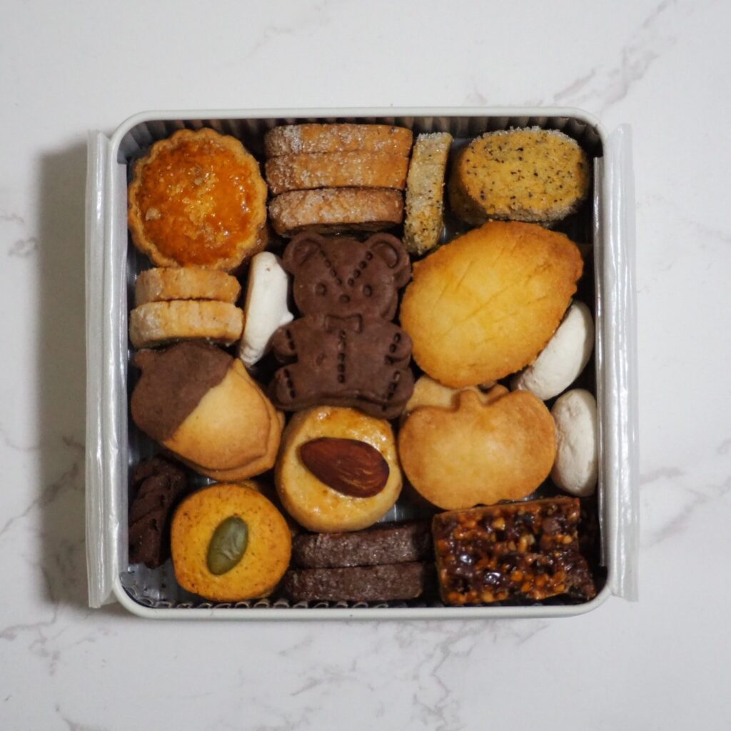 どんぐりクッキー(プレーン)、くまさんクッキー(ココア)、かぼちゃクッキー(プレーン)、葉っぱクッキー(パンプキン)、ラムレーズンクッキー、サブレオランジュ、カシューナッツクッキー、ムラングアマンド、紅茶クッキー、フロランタンショコラ、サブレアマンド、サブレポティロン、岩塩クッキーなど13種類のクッキーが入ったクッキー缶です。