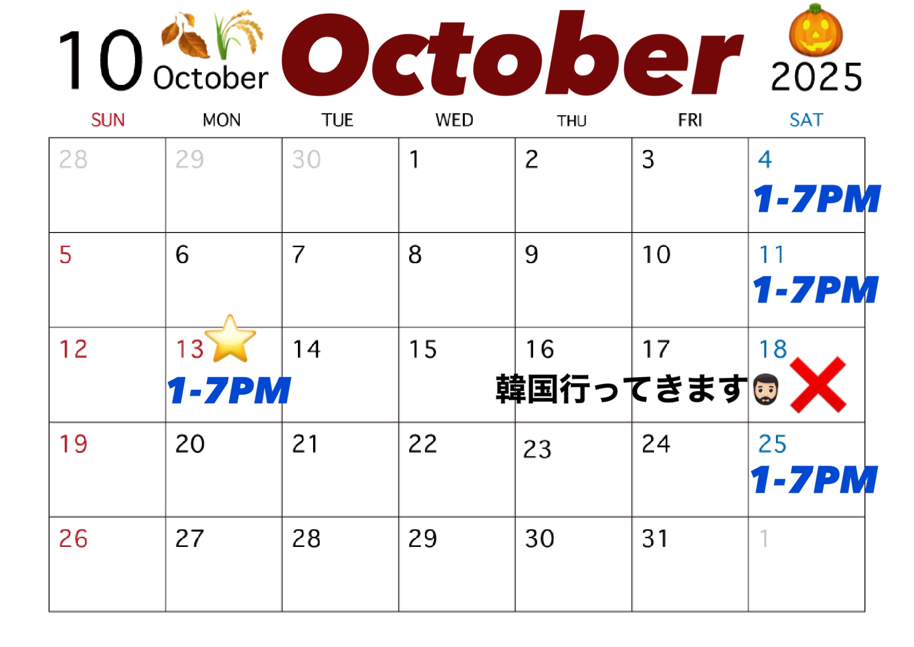 今月は10月13日(月曜)が祝日のため、月曜にも営業いたします!